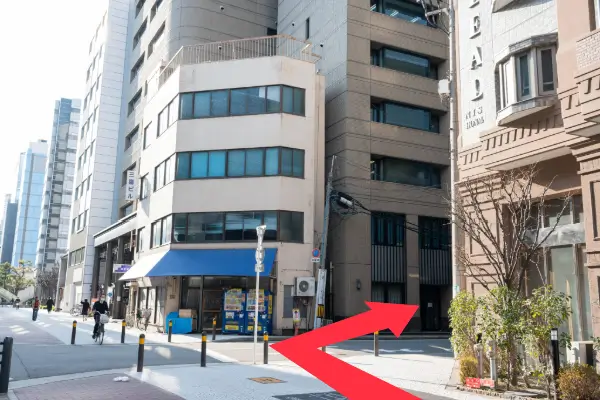 突き当りまで進んでいただくと、正面に「新興産ビルディング」、左手に「タイムズ西本町第14駐車場」が見えてきます。
